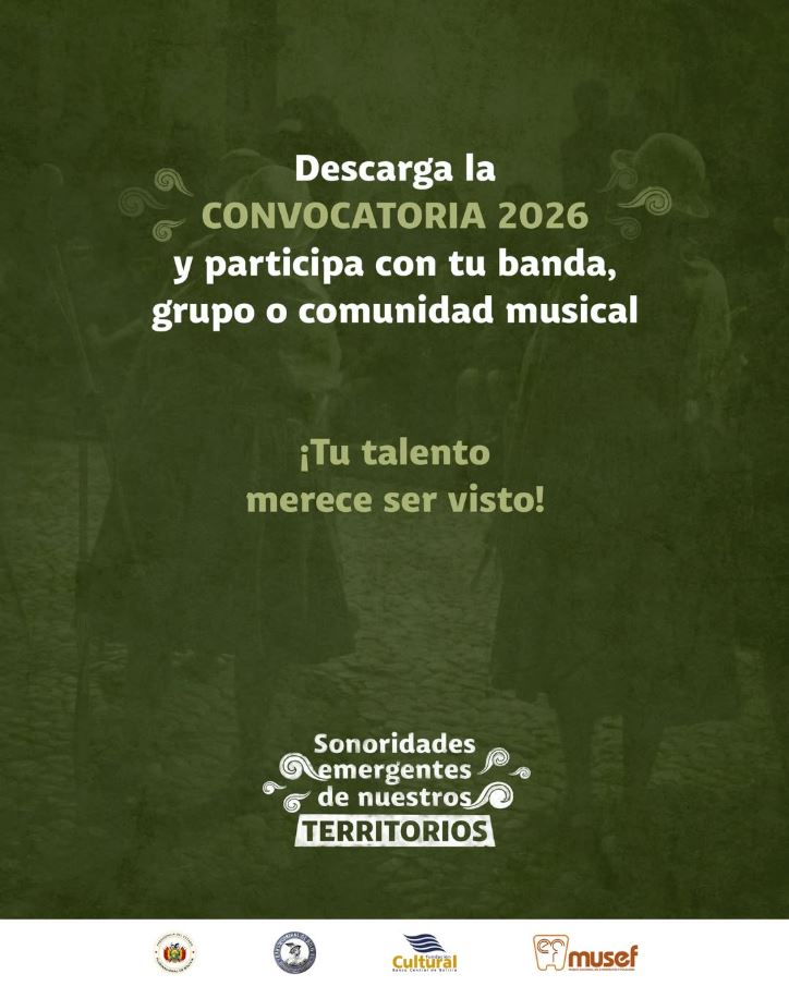 El Museo Nacional de Etnografía y Folklore (MUSEF) lanza la convocatoria 2026 del ciclo “Sonoridades Emergentes de Nuestros Territorios”, una iniciativa orientada a fortalecer la circulación y visibilización de la música boliviana contemporánea. El programa se desarrollará entre los meses de marzo y diciembre de 2026 en el auditorio del MUSEF, con conciertos programados todos los jueves, a excepción de fechas correspondientes a la RAE 2026 y días feriados.